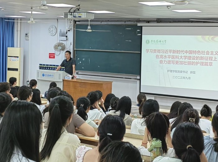 在南校区举办2023级新生师生见面会,学院党委书记薛磊、院长洪静芳及全体院领导出席会议。会议由学院党委副书记王磊主持。薛磊向全体2023级新生表示热烈欢迎,并简要介绍了学院的办学历史。他勉励同学们要牢记医学生誓言,追寻前辈足迹,传承红色基因,秉承“好学力行,造就良医”的校训,将个人的发展同祖国前途、民族命运紧密联系在一起,践行“弘毅担当、精医报国、康民济世”的安医精神。他希望同学们热爱伟大祖国,锚定青春航向;练就过硬本领,勇攀专业高峰;锤炼品德修为,追求卓越人生,在未来的大学生活里云程发轫,万里可期。洪静芳为新生作了题为《惟健康承载幸福,以奋斗成就未来》的入学教育报告。她以“何为守护”这一问题切入,引发学生们思考,并围绕护理学等专业的专业价值、人生价值、社会需求,以及学院声誉、教学资源、科学研究、合作交流等,对同学们进行专业思想教育。她鼓励新生们在未来的学习和生活中要树立目标、强身健体、心怀感恩、承担责任,为实现护理事业的发展作出贡献。学院周利华教授作为教师代表发言,寄语新生传承南丁格尔精神,不负青春韶华。学院2023级本科、硕士、博士研究生新生以及老生代表也分别发