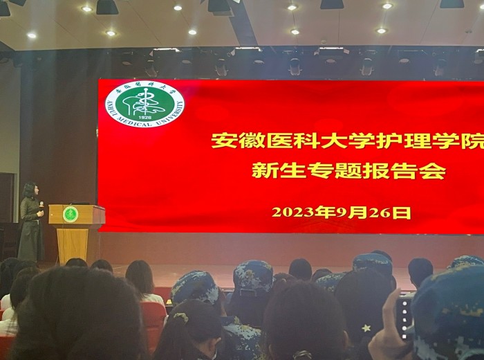 洪静芳为新生作了题为《惟健康承载幸福,以奋斗成就未来》的入学教育报告。她以“何为守护”这一问题切入,引发学生们思考,并围绕护理学等专业的专业价值、人生价值、社会需求,以及学院声誉、教学资源、科学研究、合作交流等,对同学们进行专业思想教育。她鼓励新生们在未来的学习和生活中要树立目标、强身健体、心怀感恩、承担责任,为实现护理事业的发展作出贡献。