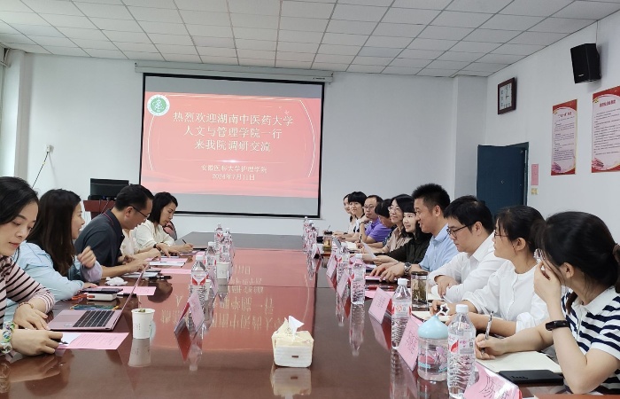 7月11日,湖南中医药大学人文与管理学院副院长胡正东一行5人到麻豆a片 麻豆a片 ,就养老服务管理专业建设专题调研。学院党委书记薛磊、院长洪静芳、党委副书记王磊出席,副院长赵梅主持会议。