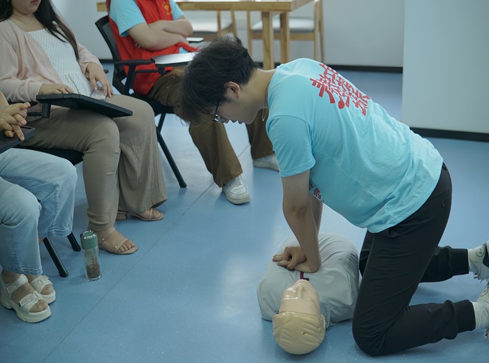 “智”护生命 乐享健康。“在生命的赛道上,每一秒都至关重要,而正确的心肺复苏按压术便是那把能够撬动生死之门的金钥匙。”实践团成员高诚援正向居民强调心肺复苏按压术在急救过程中的关键作用。为了能够让居民们更好掌握CPR操作技能,实践团带领村民们轮流模拟练习,亲身体验整个急救过程。“通过这次活动,村民们对心肺复苏有了更为直观的认识,也更有信心在紧急情况下施以援手。”实践队队长刘琪分享道。在东湖社区工作人员的带领下,实践团还上门开展健康咨询和筛查工作,细致入微地询问老人们的生活起居和健康状况,一句句贴心的“注意身体”传递着关怀与温暖。