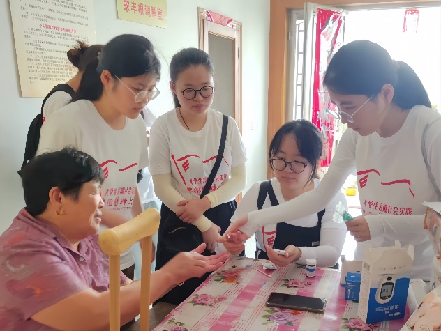 在万金山社区卫生所宋所⻓的引领下,实践团队深入社区,对当地的空巢老人进行了走访和慰问。志愿者们精心准备了一些日常生活常用物品作为慰问品,亲自上⻔为这些孤独的老人们提供血糖和血压的监测服务。在服务过程中,他们用青春活力和热情关怀,为老人们带去了温暖和慰藉。