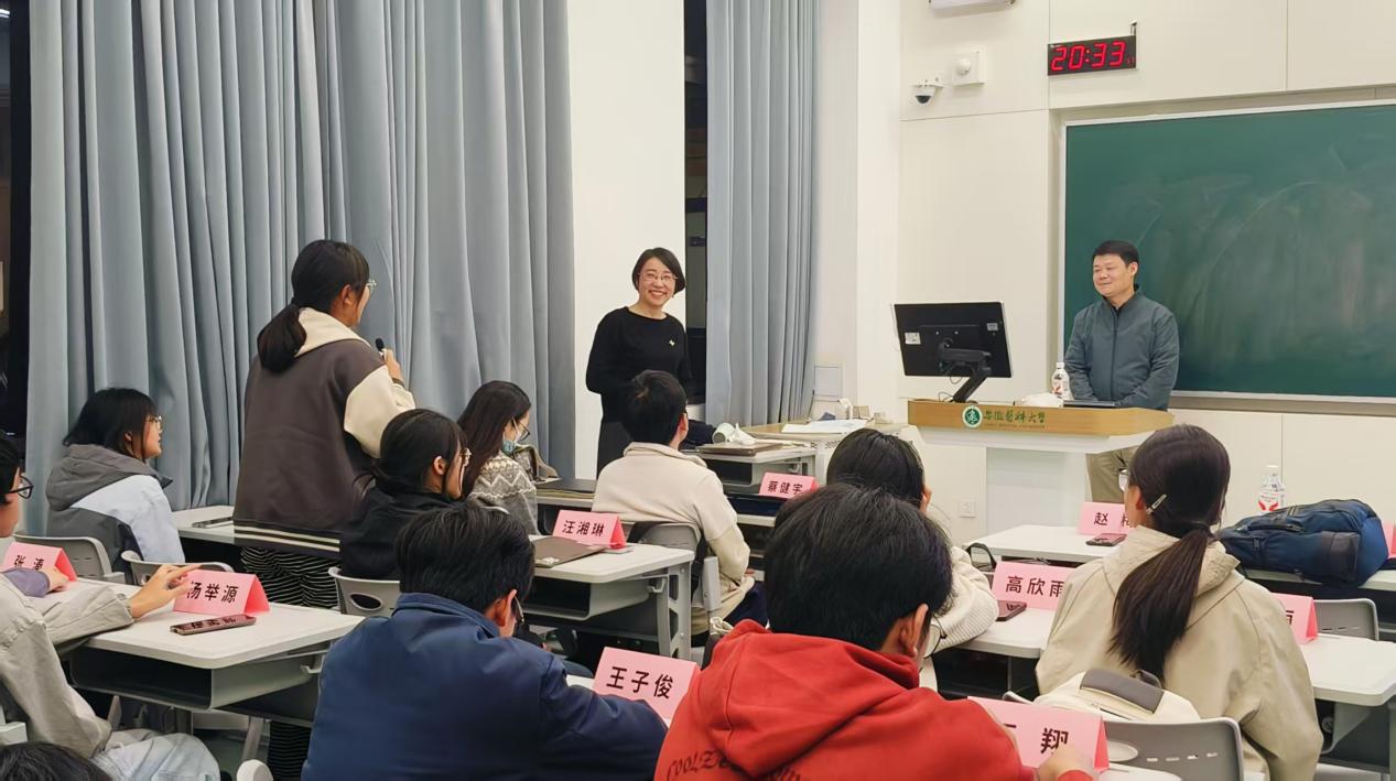 两节课程层层递进、紧密衔接:分别从宏观医疗视角搭建AI技术认知框架,以及从微观营养层面剖析具体应用场景,共同构建起 “技术+专业” 的跨学科课程。课堂上,同学们专注听讲、积极互动,就AI技术落地难点、营养管理智能化等问题与授课专家深入交流,氛围浓厚。