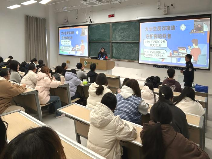 防范电诈环节,肥西县公安局城关派出所邀请同圆反诈义警殷添坤,以“大学生反诈攻略:守护你的钱包”为题,结合近期高发的电信网络诈骗真实案例,聚焦“刷单返利”“校园网贷”等新生易遭遇的诈骗类型,细致拆解作案流程与隐蔽陷阱。她着重提醒新生,遇疑问及时询问辅导员、学校保卫部门或拨打96110反诈中心电话核实,避免财产损失。