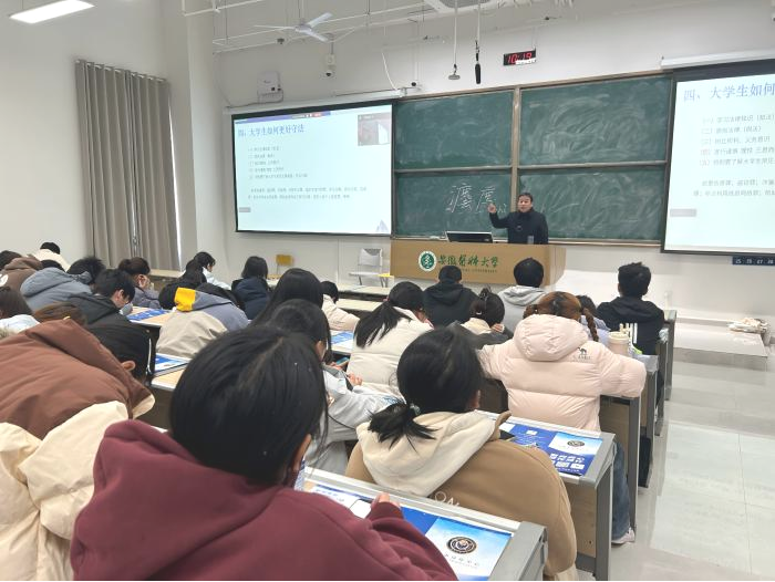 法学院副教授尤金亮应邀以“法治社会中大学生的守法与护权”为主题开讲。他结合新生学习生活实际,深入浅出讲解法律知识,既引导新生树立遵法守法意识,也传授维护自身合法权益的方法,助力大家理解“遵法学法守法用法”的深刻内涵。