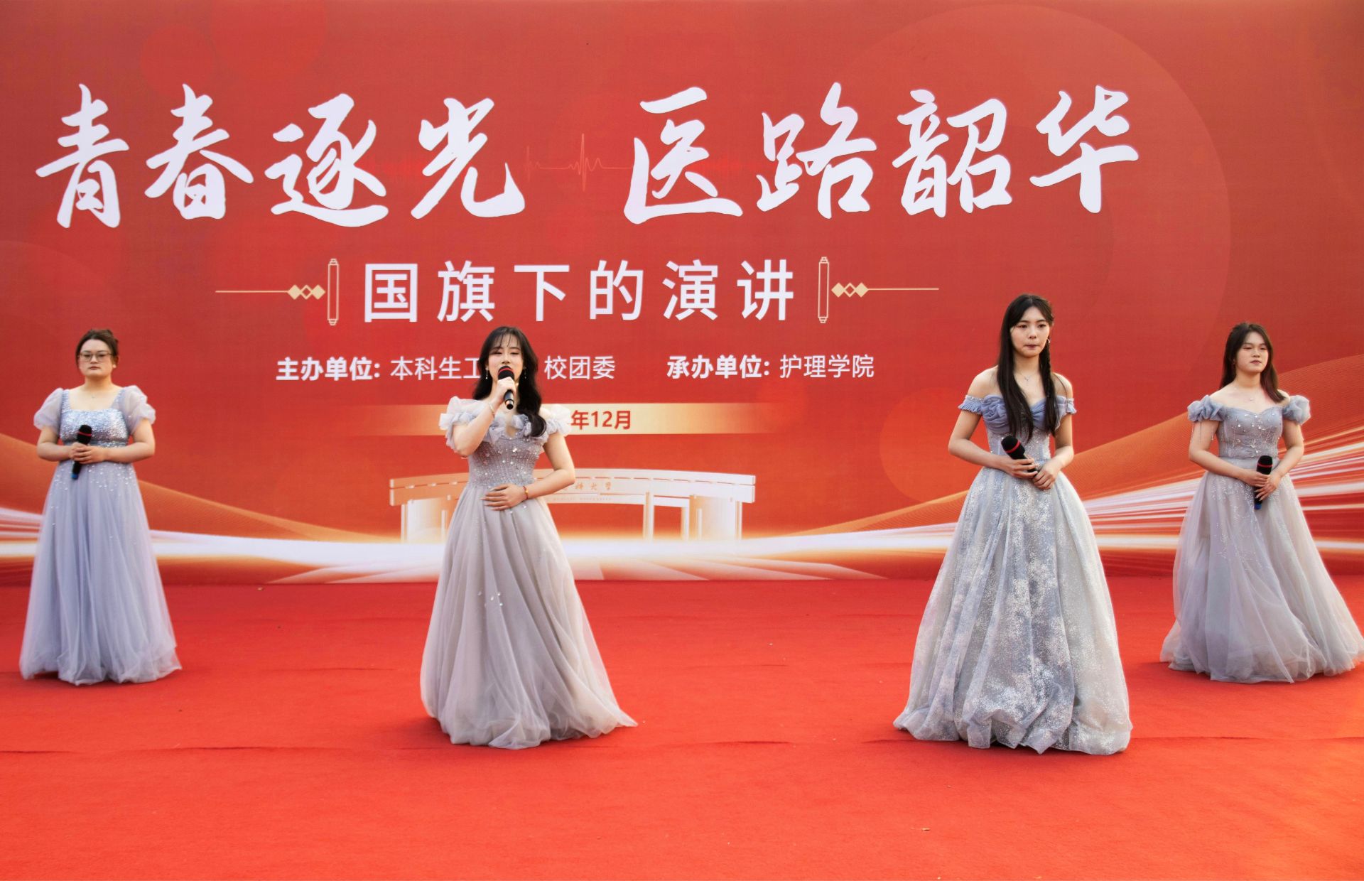 合唱歌曲《如愿》旋律悠扬,承载着对家国岁月的深情回望。同学们以真挚饱满的情感、整齐嘹亮的唱腔,将新时代青年对伟大祖国的赤诚热爱、对美好生活的由衷礼赞融入每一个音符,展现了安医学子以青春之我守护人民安康、助力民族复兴的青年担当。